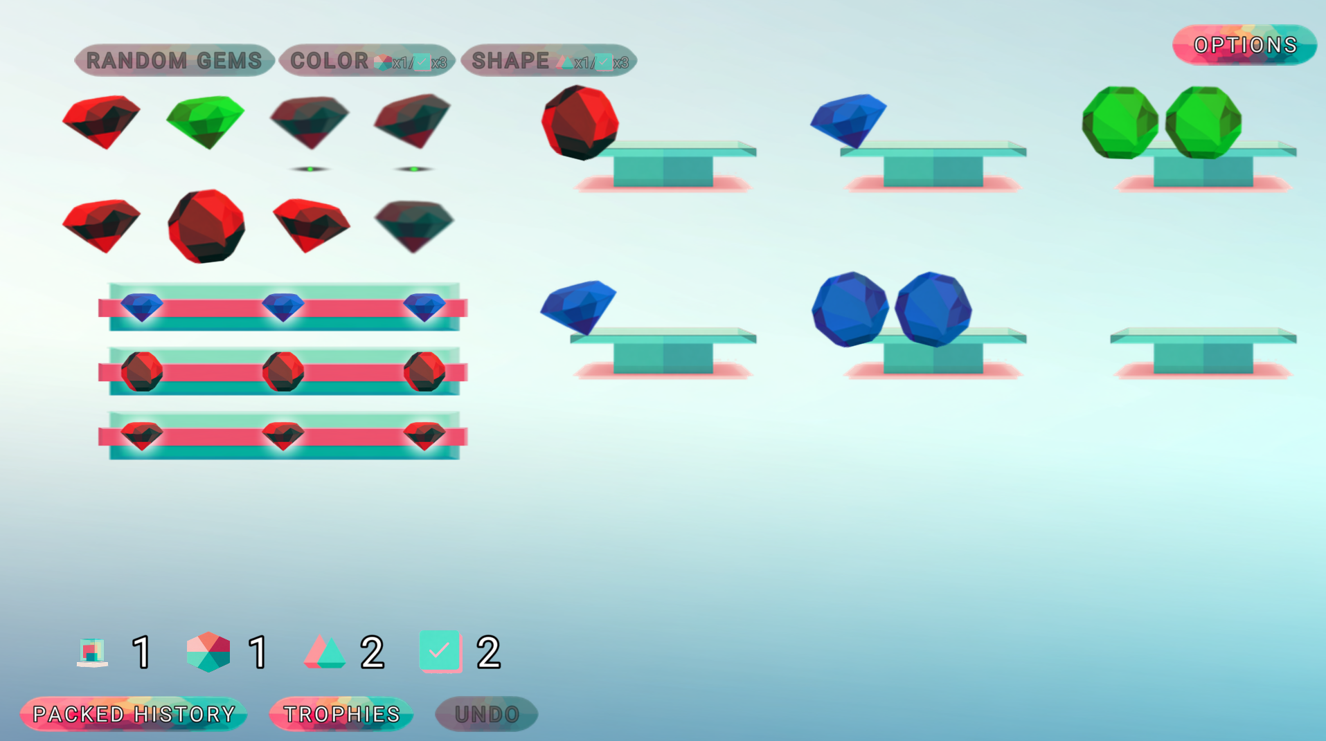 - "Random" - free button, respawns 3 random gems. Always available